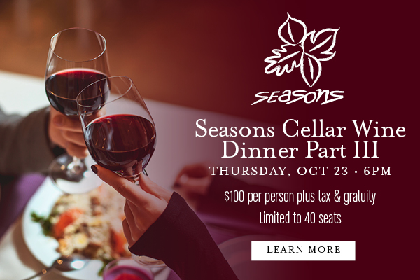 We are excited to invite you to our Seasons Cellar III Wine Dinner on Thursday, October 23rd at 6:00 PM. This exclusive evening will feature a carefully curated five-course wine pairing experience for $100 per person plus tax and gratuity.