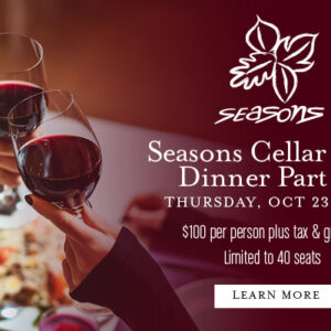 Dear Guests, We are excited to invite you to our Seasons Cellar III Wine Dinner on Thursday, October 23rd at 6:00 PM. This exclusive evening will feature a carefully curated five-course wine pairing experience for $100 per person plus tax and gratuity. ✨ Featured Wines: 2022 Domaine du Salvard, ‘Le Petit Salvard’, Sauvignon Blanc, Loire, France 2022 Trefethen, Chardonnay, Oak ... Read More